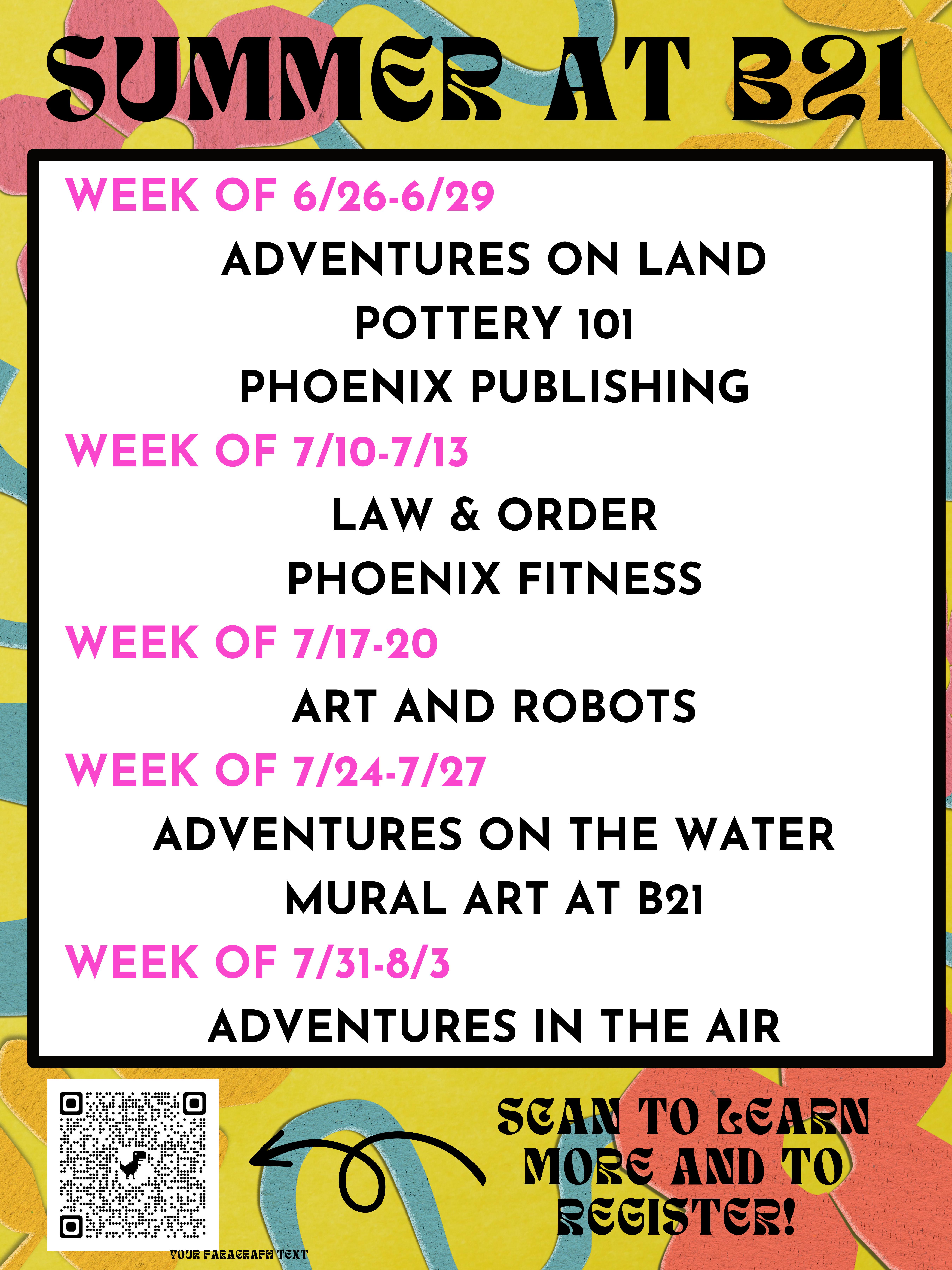 Summer at B21! Posted by Melissa Routson on Thursday, June 1, 2023 at 8:43 am SUMMER AT B21Fill out this form if you are interested! Comments No comments have been posted yet. Log in to post a comment.
