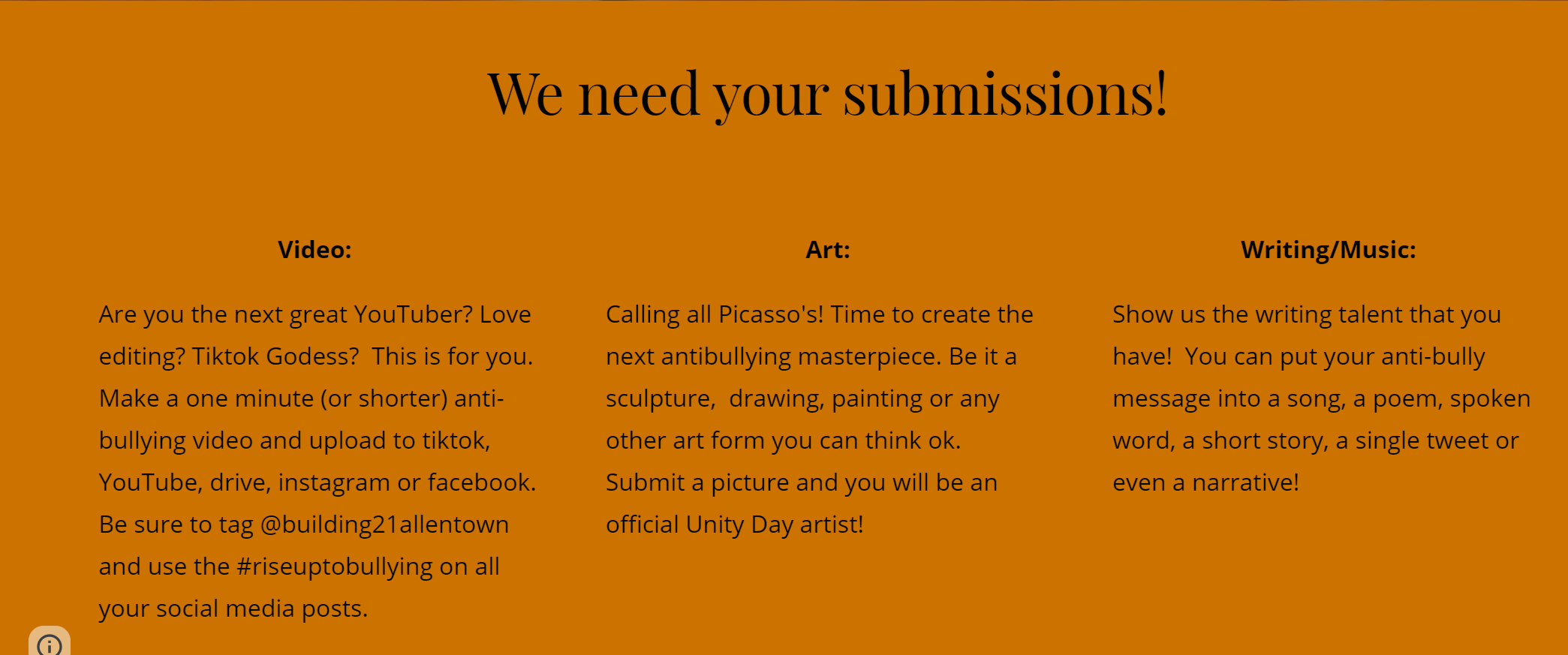 Click on this [link] (https://sites.google.com/b21.allentownsd.org/riseuptobullying/unity-day-guidelines?authuser=) to see details on how to enter the Rise Up Against Bullying contest